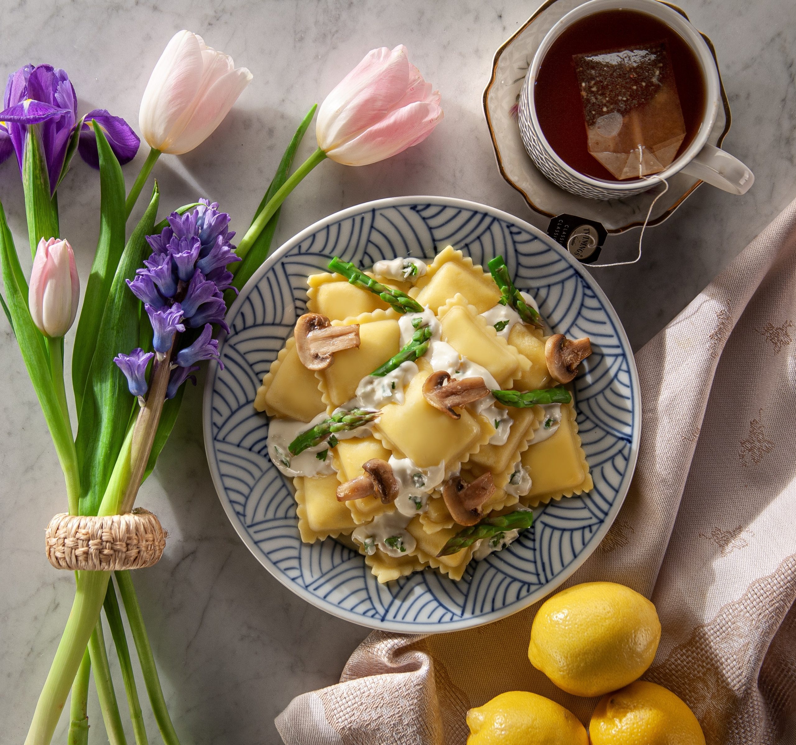 Bring a large pot of water to a boil, add the asparagus and cook for 4 minutes. Remove the asparagus, chill in cold water and set aside. Cook the ravioli according to the package directions. Drain and set aside in a covered bowl. In a skillet over medium heat, add the olive oil, mushrooms and garlic and cook 5-7 minutes. Add the white wine (optional) and heavy cream. Bring to a simmer and cook for 5-7 minutes until the cream thickens. Add the lemon juice, cooked ravioli, asparagus and parsley to the sauce. Toss to coat evenly and season with salt and black pepper. Divide ravioli among bowls. Serve immediately.