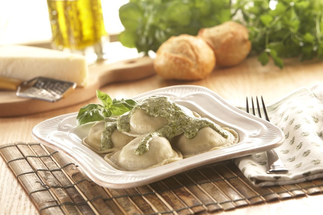 Bring a large pot of water to a boil and cook the ravioli according to the package directions. Drain and set aside. In a sauté pan over medium heat, add heavy cream. Bring to a simmer for 2-3 minutes. Lower heat and add pesto to heavy cream, mix well. Add cooked ravioli to the pan and toss to coat.Serve with basil to garnish.
