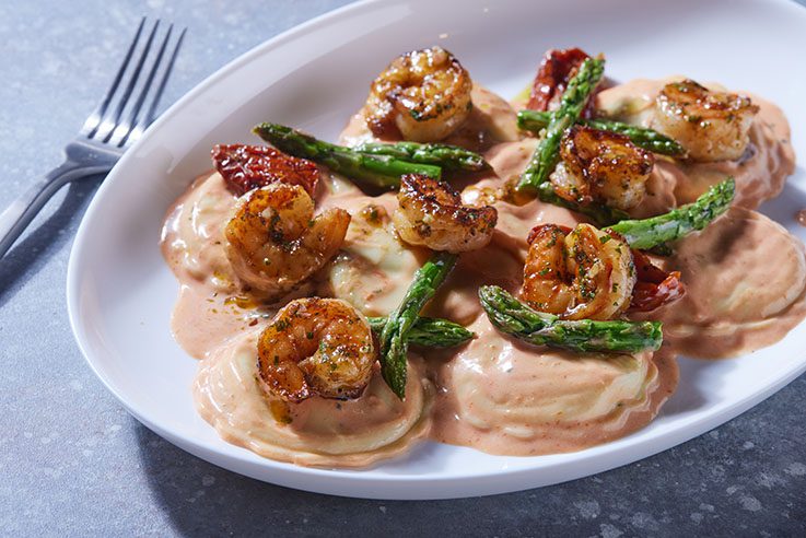 Home > Recipes > Celentano Garlic Florentine Ravioli with Black Tiger Shrimp, Fresh Asparagus and Sun-Dried Tomatoes in a Brandy Tomato Cream Sauce