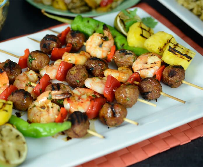 Soak skewers in water if using bamboo skewers for 20 minutes. Defrost meatballs in the microwave for 20-30 seconds. Preheat a grill to medium heat. For the marinade, combine the rum, pineapple juice, lemon juice, olive oil, chopped cilantro, and minced garlic in a bowl. Add the shrimp, meatballs, and red peppers, coating well in the marinade. Cover, refrigerate and let rest for 20 minutes. Thread each skewer with a meatball, a pepper, a shrimp, a meatball, a pepper, a shrimp, a meatball, a pepper. Grill the skewers over medium heat, for 3 minutes per side. Brush the skewers with some of the sweet chili sauce. Remove from the grill and serve each skewer with a lime half.