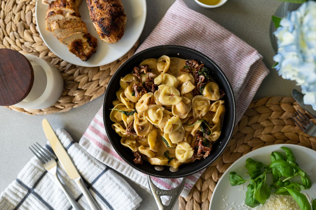 Turn heat down to medium and add tortellini, bacon, sun-dried tomatoes, and kale to the cream sauce. Cover pot and let cook for 3 minutes stirring occasionally until the tortellini is cooked through. Add the chicken into the pasta and continue to cook with the lid on for 3-4 minutes. Serve immediately.